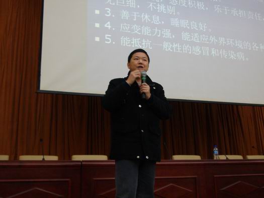 黄老师以提问的方式开始了此次讲座,他问在场同学:“你们觉得人生中什么最重要?”同学们各抒己见:“健康”、“亲情”、“爱情”、“事业”…….待同学们说完,黄老师笑道:“不错,人生有很多重要的东西,其中健康是1,事业、亲情、爱情等都是它后面的0,1没了,那0也就没作用了。”说完,同学们都赞同的点了点头。接着,黄老师借世界卫生组织对健康定下的十大标准向同学们阐述什么才是真正的健康。他说:“健康被世界卫生组织细分为“五快”和“三良”,五快:即吃得快、便得快、睡得快、说得快、走得快,这主要是身体上的;三良:即良好的人格、良好的人际关系、良好的处世态度,这是心理上的。所以,身、心都健康才是真正的健康。”随后,他道出老员工心理健康的评价标准:智力良好、自我意识明确、情绪积极、人格完整、意志健全、人际关系和谐、适应能力强。最后,他说到心理问题的普遍性,强调要正视心理问题,及时治疗。同时,他就老员工的身心健康提出两点建议:一是养成良好的个人生活习惯;二是养成健身运动的习惯。