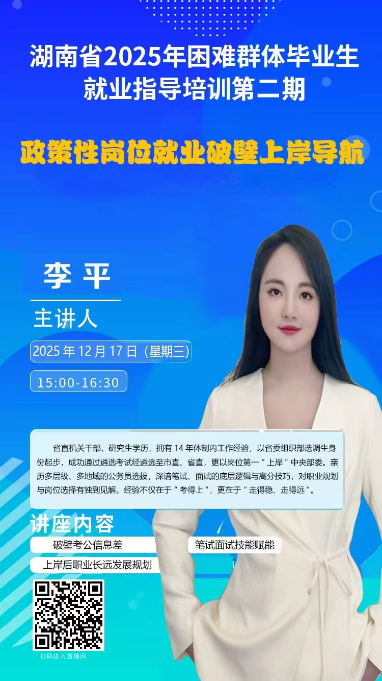 湖南省 2025 年困难群体毕业生就业指导培训(第二期)”第三场于12月17日(下午)15:00—16:30开展