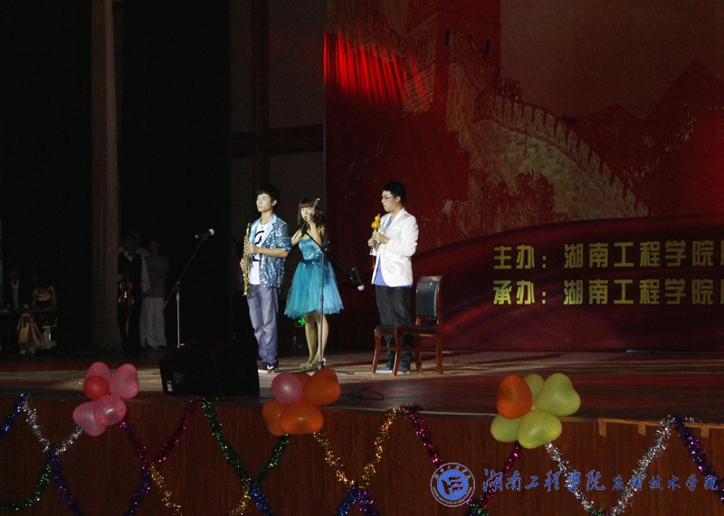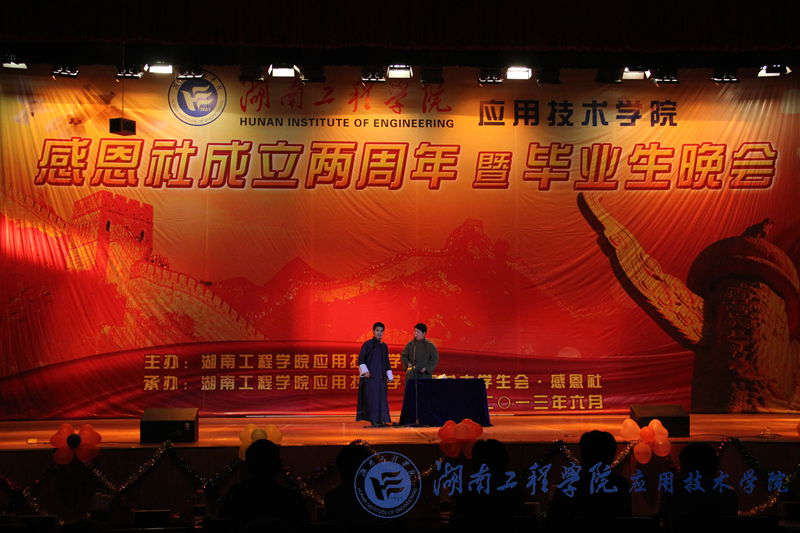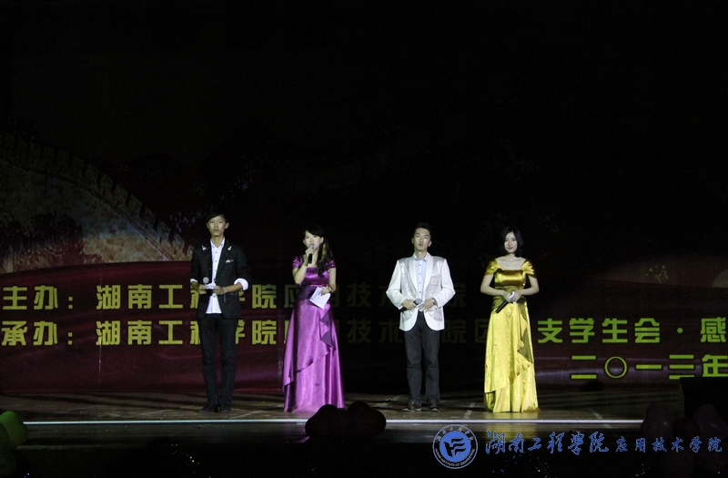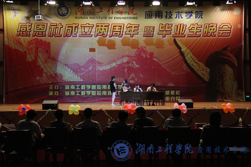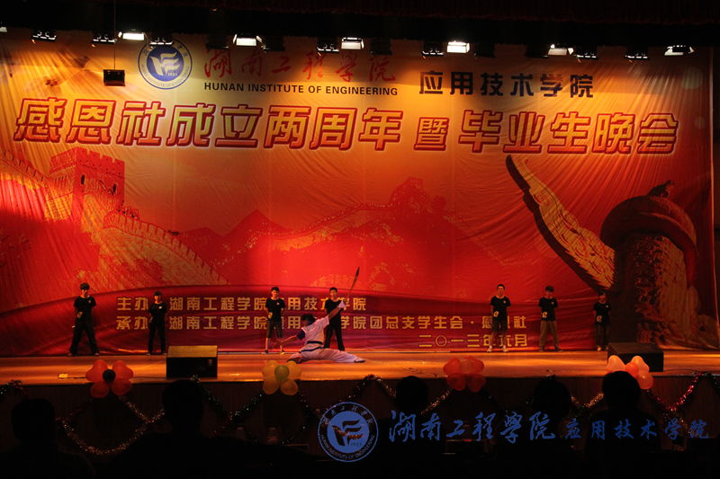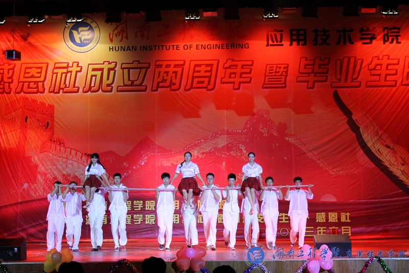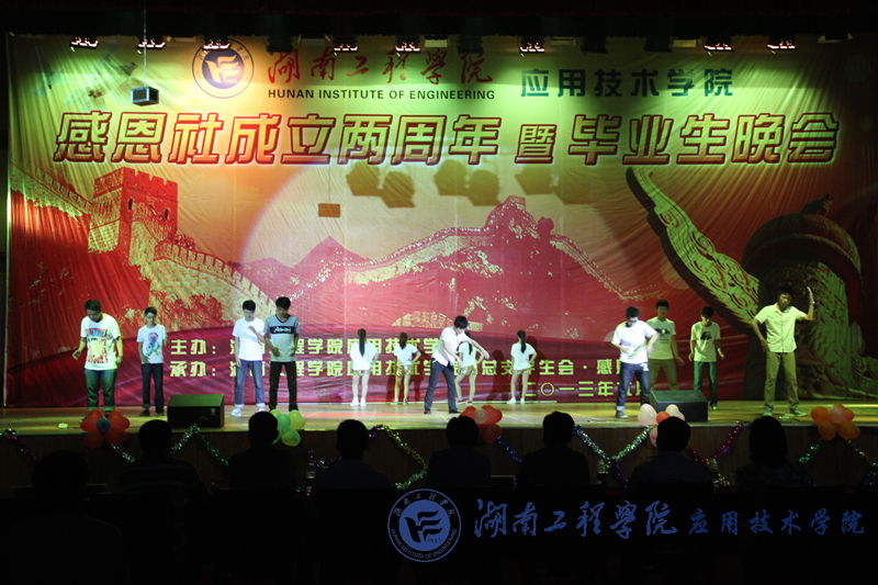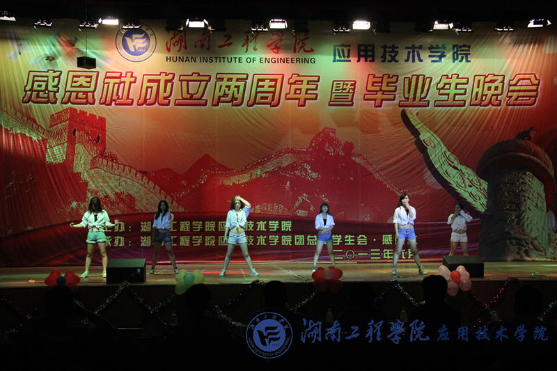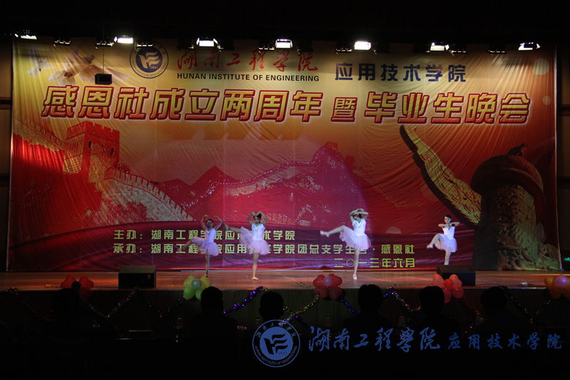 晚会一共编排了14个节目。在一段精彩的开场舞中晚会火爆开场,瞬间点燃了场下观众的热情。相声《应院三好员工》,话剧《挂科,你好》以诙谐幽默的语言和出色的表演赢得了观众热烈的掌声;乐器合奏《乐动中西》带领着大家领略到中西音乐相互交融的魅力,小提琴独奏更是成为了全场的亮点,悠扬婉转的旋律,让师生们深深的陶醉其中;健美操队带来的《啦啦操》、舞蹈队的芭蕾舞《冰与火》、极具创新意味的《英雄联盟》等节目让同学们赞叹不绝。歌曲《感恩的心》和《致青春》带领大家回忆美好老员工活中的点点滴滴,引发了同学们强烈的共鸣,回望在母校度过的青春岁月,心中满是别离的不舍;最后登场的《湖工最强音》将晚会的气氛推向了新的高潮,公司校园歌手大赛冠军邓淑君的歌声赢得了同学们的连连叫好。