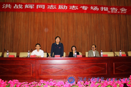 洪战辉主要从自己人生经历的四个方面作了报告。第一,立足现实,做自己该做的事情。大学期间,因为家庭经济困难,在校园向老师和员工推销产品挣钱养家。用自己的双手为患病的父亲和捡来的妹妹撑起一片天,在挣钱的过程中虽然辛苦,但也收获了很多人没有的东西。第二,物质生活匮乏,精神生活充实。他说:“建立在物质上的快乐是不长久的,真正的快乐是内心的快乐。”小时候,尽管家里很贫穷没有任何玩具,但是儿时很幸福。自己会开动脑筋思考周围的事物,从中寻找快乐。第三,做错事情,多问为什么。每当犯错时,经常问自己为什么,找到正确的方法解决问题。犯过的错决不再重犯。第四,如何逼近成功,拾起自信。“现在不代表未来,现在拥有的并不代表未来拥有。父母没有让我们过得好,但我们要让父母过得好。”他希望现在不是很优秀的同学及家里不富裕的同学要好好学习专业知识,将来找份好的工作报答父母和社会。在接下来的提问环节中,就怎样看待老员工兼职工作,洪战辉觉得兼职只是副职不是老员工的主职,老员工的主职是学好专业知识。在问及如何看待大学谈恋爱时,他说:爱情是美好的,但主张恋爱要谨慎不要随便的与人谈恋爱,否则自己会受伤,也会伤害别人。