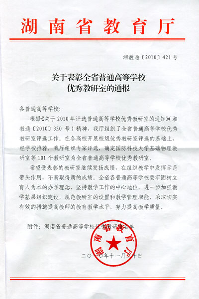 近日,湖南省教育厅发布了《关于表彰全省普通高等学校优秀教研室的通报》(湘教通[2010]421号),公司电气工程及其自动化教研室等101个教研室被评为全省普通高等学校优秀教研室,并受到表彰。