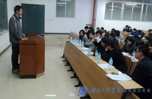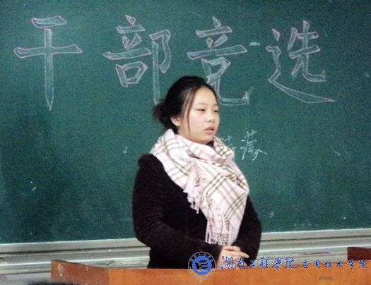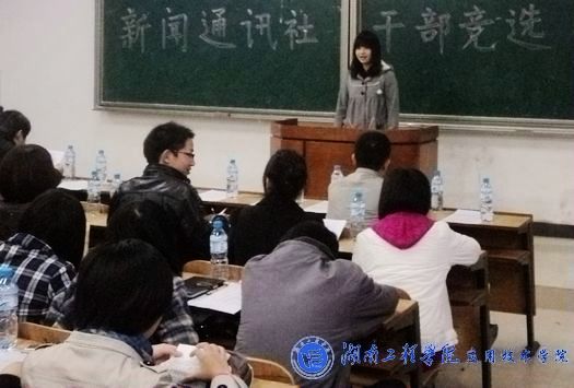 竞选分为两个环节:竞选人自述和评委提问。自述环节,大家准备的都比较充分,无论是对过去工作的总结、成绩的表述还是就任后的打算,在台上都能镇定自若,徐徐道来。这其中,也出现了此次竞选环节里最温馨的一幕:记者团副主任李赞和专题部副主任王婷主动放弃竞选,把宝贵的机会让给了其他成员。而最精彩、最悬念、最动人心弦的要数摄影部主任蒋艳与记者团主任刘娅子的社长之争。先上台的是蒋艳,在一段自我介绍后,她便谈起任职后的打算,将会从责任心和管理两个方面入手,对员工新闻通讯社进行整顿提高。其充分的准备、妥善的计划得到了评委们的点头称赞。而刘娅子也是自信满满、成竹于胸,面对评委们的提问也是对答如流。对于评委提出如何提升员工新闻通讯社,其更显睿智,她说:我希望加强与湘潭大学、湖南科技大学这两个兄弟学校员工新闻通讯社的交流合作,在互相取经的同时构建一个交流平台,增加学校员工间的联系交流。蒋艳和刘娅子两人的工作态度和能力都是有目共睹的,一个稳扎稳打、深思熟虑,一个雷厉风行、干脆利落,两人一时瑜亮,让评委难以取舍。