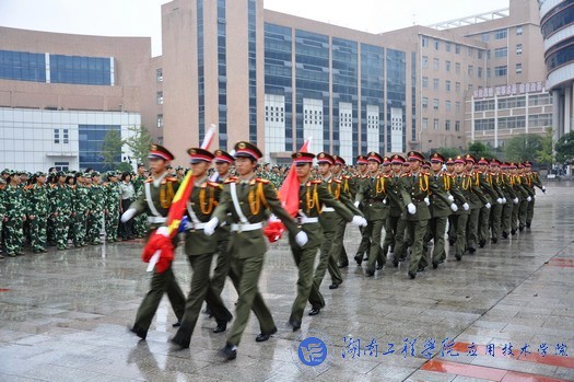 这几日新生正处于军训阶段,各项活动都按军事化的标准来进行。6点整,全体新生身穿迷彩服,统一集合完毕;7点整,升国旗仪式正式开始,只见国旗护卫队的同学们踢着整齐划一的正步迈向升旗台,然后把国旗交到升旗手手中,随后,国歌响起,全场同学立刻脱帽,神情肃穆,口中和着节奏轻唱国歌,眼睛注视着国旗缓缓升起。虽然在升旗过程中一直是秋雨潇潇,但丝毫没有影响到新生们参加升旗仪式的热情,场面十分壮观。
