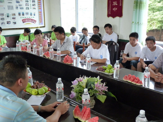首先,聂乡长给介绍了双江乡的地理位置、面积、人口等基本情况,着重从农业、工业、生态旅游、党建的四个方面介绍了该乡的发展状况,总结了该乡近几年所取得的丰硕成果,并对“三下乡”服务团成员提出三点要求:一要进一步深入基层,进一步加深对“三农”的理解;二要以自身的经历正确地引导留守儿童的健康成长;三要结合专业知识给农民群众提出具有价值意义的思维方式与建议。接着,南老师、娄老师分别介绍了此次“文化宣传、社会调研、爱心扶助”等三项活动的主题内容。负责接待的校方及有关村支书表示将对老员工服务团队的各项活动提供最大的帮助与支持。