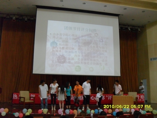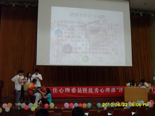 6月22日下午3:00,学校“十佳心理委员暨优秀心理部”评选活动在主校区(新)图书馆一报告厅举行。经过各学院心理咨询部门的集体节目表演、心理健康知识问答和心理委员们的工作交流等三个环节之后,公司员工会心理咨询中心被评为学校“优秀心理部”。