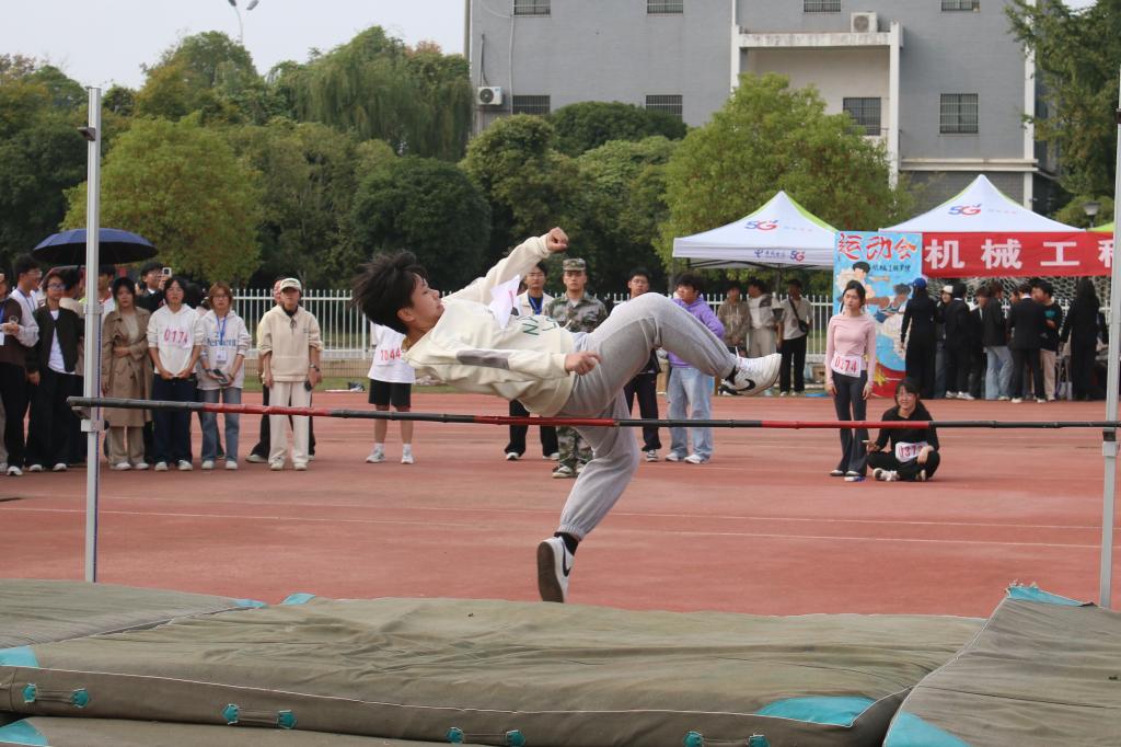 比赛伊始,现场氛围热烈非凡,各学院选手依次登场,目光锁定横杆,在起跑处做好热身准备。随着比赛推进,横杆的高度不断抬升,赛况也愈发紧张。面对1.05米、1.10米的基础高度,彭欣怡沉着应对,她找准助跑节奏,脚下步伐轻快而稳健,临近横杆时猛地加速,蹬地起跳,身体以标准的背越式姿态腾空而起,如轻燕掠空般顺利过杆,当横杆升至1.16米,赛事进入关键阶段,部分选手因压力过大或技术失误接连败北。彭欣怡深吸一口气,踏跳、腾空、过杆动作衔接流畅,横杆纹丝不动,她成功拿下这一关键高度,顺利跻身决赛。