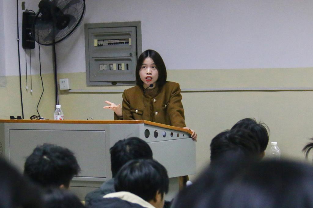 杨欢老师围绕新闻稿核心价值、写稿准备、结构搭建、语言技巧、新闻摄影五大模块展开详细讲解。她以互动式教学开场,抛出一个常规新闻标题,邀请同学们进行优化修改。在热烈的交流中,同学们对新闻标题需突出亮点、精准传递核心信息的要点有了更直观的认识。她以“时隔34年,两位校运会5000m冠军的越洋连线”为例,向同学们示范了如何凸显新闻策划与传播价值的重要性,让同学们深刻理解新闻选题的独特视角与深度挖掘;她解析了“倒金字塔”结构和“5W1H”六要素,指导同学们搭建“标题—导语—主体—结语—背景”的新闻骨架;她重点阐述了新闻摄影需遵循的主题明确、画面简洁、讲述故事、遵守伦理的原则,并结合校园活动拍摄场景,叮嘱同学们要聚焦主体、避开干扰元素,捕捉能体现新闻内涵的鲜活瞬间。